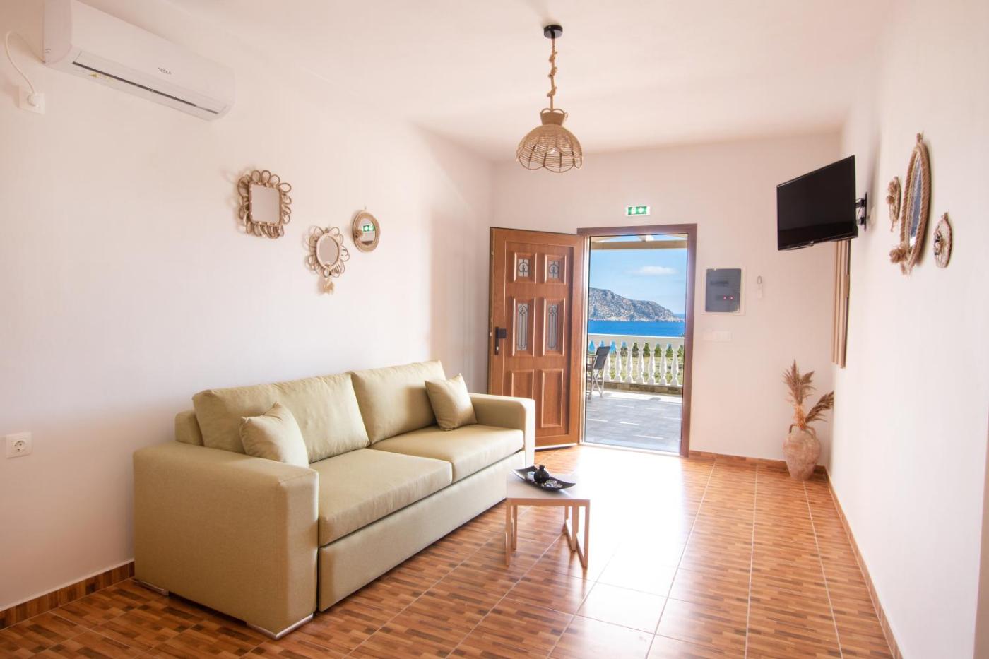 One-Bedroom Apartment. Boasting a private entrance, this air-conditioned apartment comes with 1 living room, 1 separate bedroom and 1 bathroom with a shower and a hairdryer. Guests can make meals in the kitchen that features a stovetop, a refrigerator, kitchenware and a toaster. Featuring a terrace with sea views, this apartment also features a seating area and a flat-screen TV with cable channels. The unit has 2 beds.