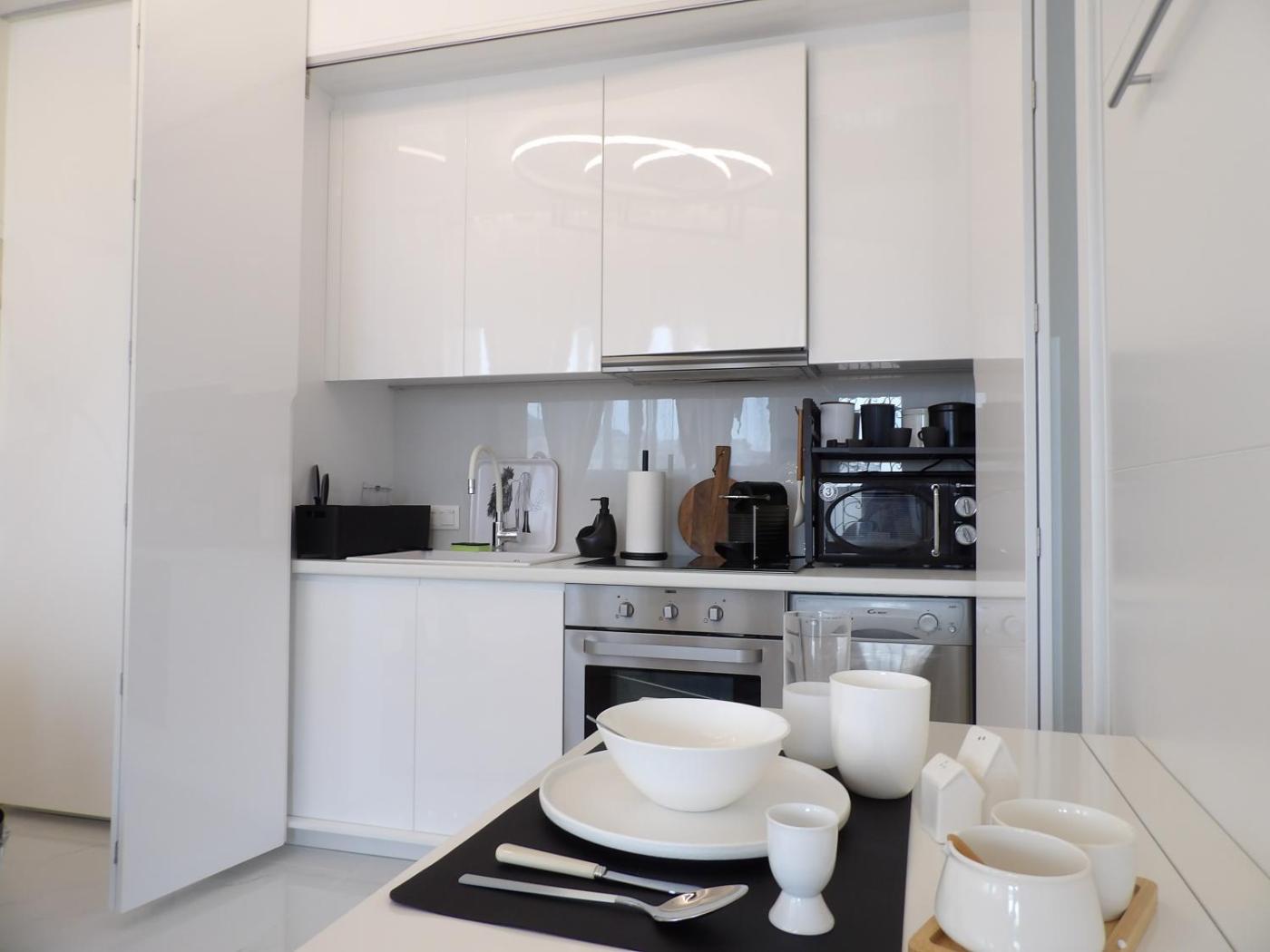 One-Bedroom Apartment. Featuring a private entrance, this air-conditioned apartment consists of 1 living room, 1 separate bedroom and 1 bathroom with a walk-in shower and a hairdryer. Meals can be prepared in the kitchen, which is equipped with a stovetop, a refrigerator, a dishwasher and kitchenware. Boasting a terrace with city views, this apartment also provides a washing machine and a flat-screen TV with streaming services. The unit offers 1 bed.