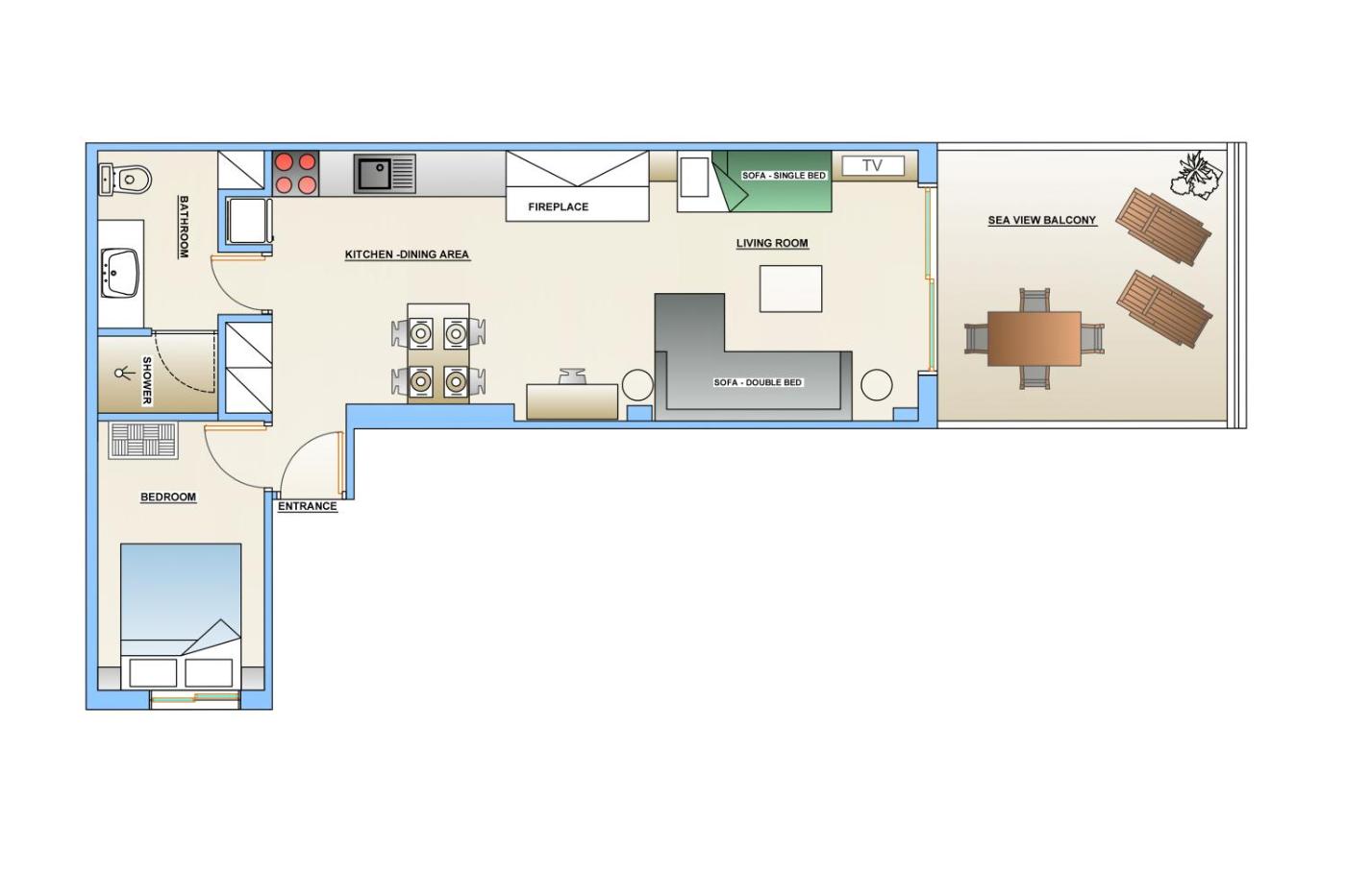 One-Bedroom Apartment with Sea View. Offering sea views from its private balcony, this air-conditioned apartment has a separate bedroom with double bed and a living room with a sofa bed for 2 people and a single bed. A flat-screen TV is included. Please note that this room type can accommodate an extra bed upon request and extra charge (subject to availability). ;