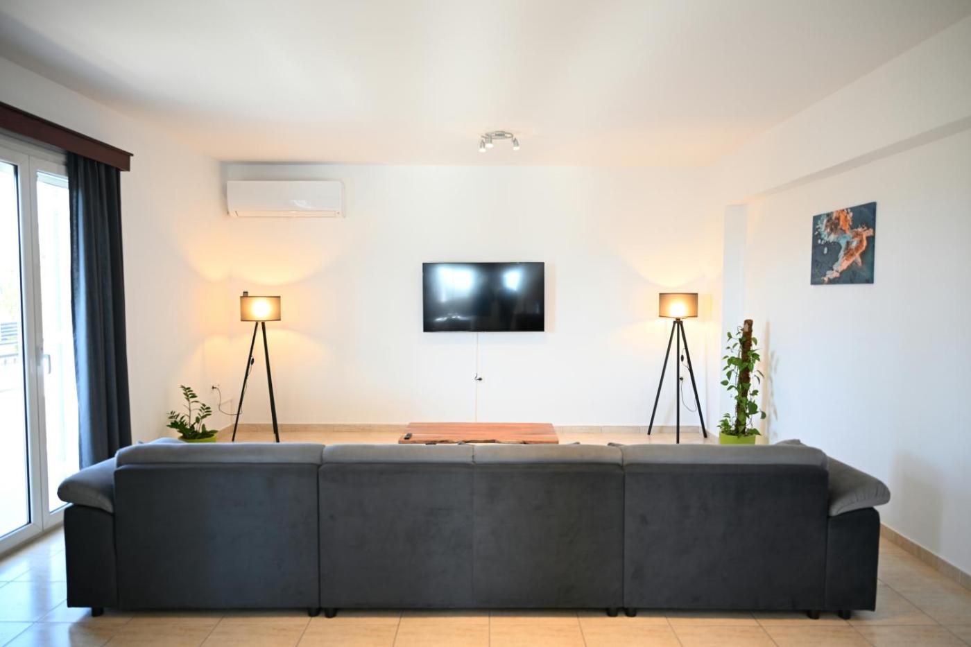 Apartment with Sea View. Guests will have a special experience as the apartment features a fireplace. Featuring a private entrance, this air-conditioned apartment consists of 1 living room, 2 separate bedrooms and 1 bathroom with a walk-in shower and a bath. Guests can make meals in the kitchen that is equipped with a stovetop, a refrigerator, kitchenware and an oven. The spacious apartment provides a washing machine, a seating area, a dining area, a flat-screen TV with streaming services, as well as sea views. The unit offers 4 beds.