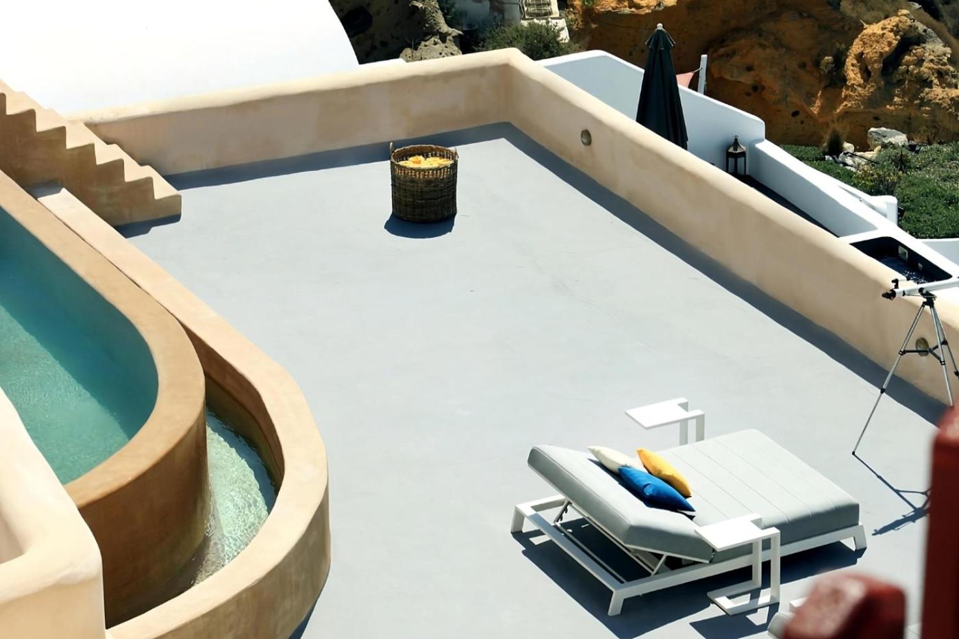 The villa consists of two independent suites. One suite consists of one master bedroom, an open plan living and sleeping area and a bathroom with shower. The second suite consists of two bedrooms, a living room with a sofa bed and a bathroom with shower. Both suites share a private terrace of 340 m2 and an infinity swimming pool with view to Caldera.