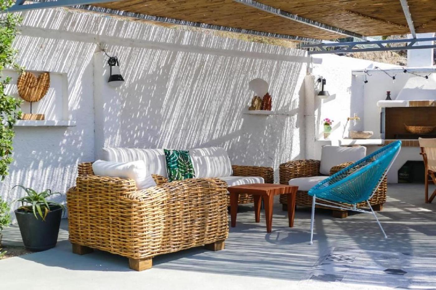 Christou Entire Estate. Elegantly designed, the whitewashed estate features 3 private villas within a 5.500 m² land of olive trees, cypresses, pomegranate trees, herbs and gardens with organic local vegetables. It includes 3 private pools, 3 private BBQ areas, an outdoor hot tub and panoramic views of the island, the vineyards and the Aegean Sea. Each villa also has a living room and an open plan kitchen area. Other facilities include an outdoor mini gym and a Turkish marble steam room.