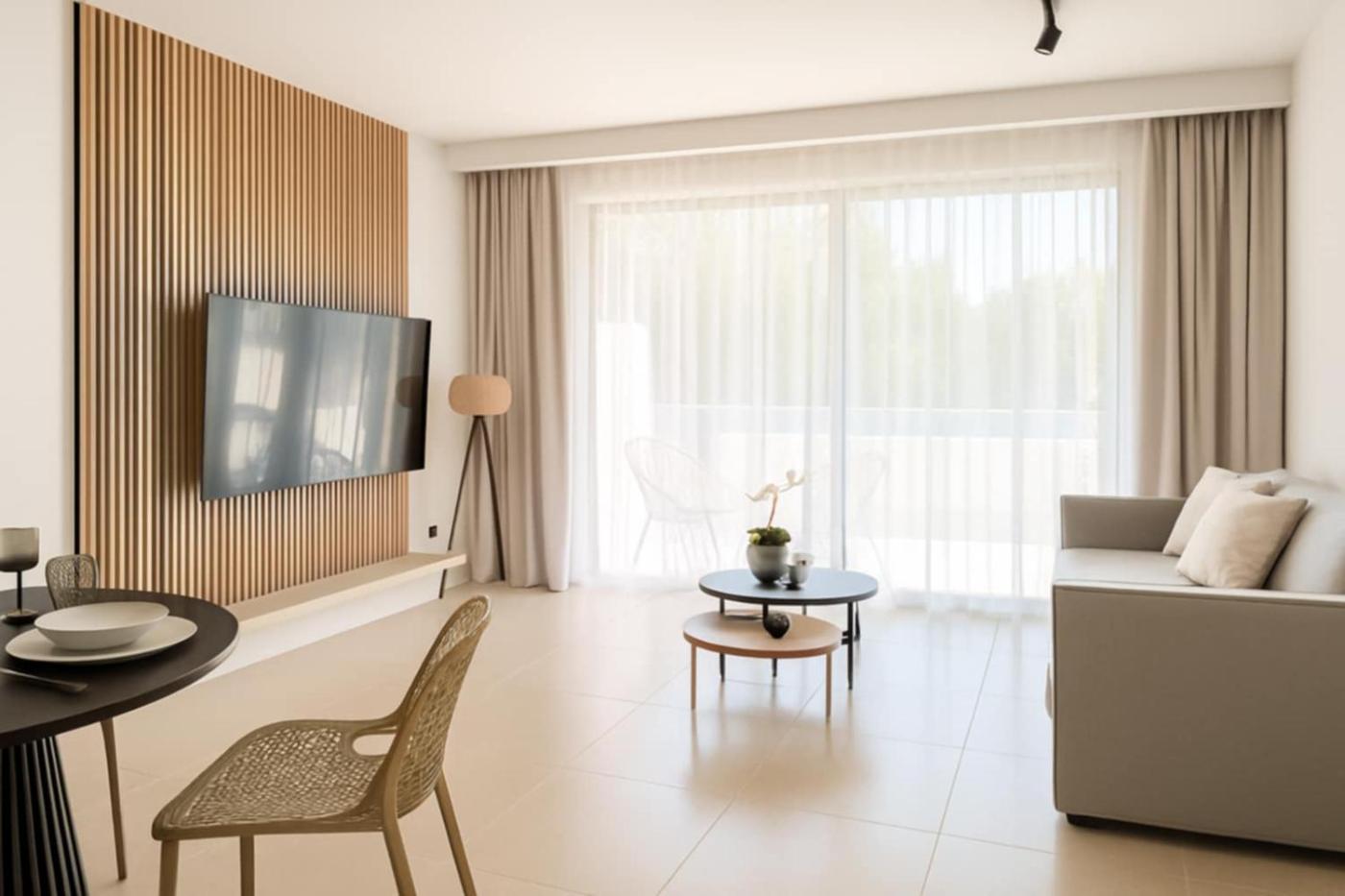 One-Bedroom Apartment. This apartment provides a private pool. This air-conditioned apartment comprises 1 living room, 1 separate bedroom and 1 bathroom with a bath. The well-equipped kitchen has a stovetop, a refrigerator, kitchenware and an oven. The unit features a washing machine, garden views, a terrace and winechampagne is featured for guests. The unit offers 2 beds.