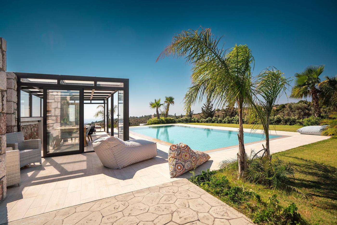 Book private villas in Greece, luxury estates, country manors, poolside homes, gated properties, panoramic retreats, olive grove havens, and cliffside dwellings throughout Greece's mainland and islands for premium rentals and exclusive getaways. Boutique estates feature pet-friendly villas, large group houses, wedding venues with private pools, infinity pools, outdoor jacuzzis, barbecue areas, chef kitchens, home cinemas, fitness gyms, tennis courts, horse riding stables, and golf course proximity. Book!